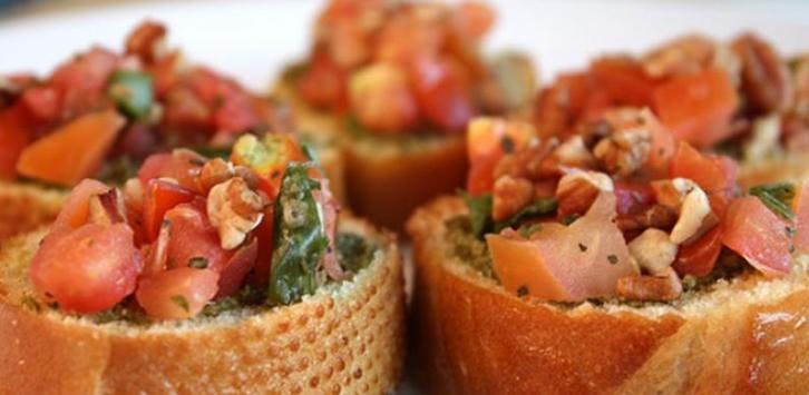 Pesto:3 tablespoons walnuts, chopped2 cups basilPinch sea salt2 cloves garlic, minced¼ cup freshly grated Parmesan cheese1 cup THC olive oilBruschetta:1 large loaf ciabatta bread, cut into thick slices3 tablespoons THC olive oil3 organic farmers' market tomatoes, diced