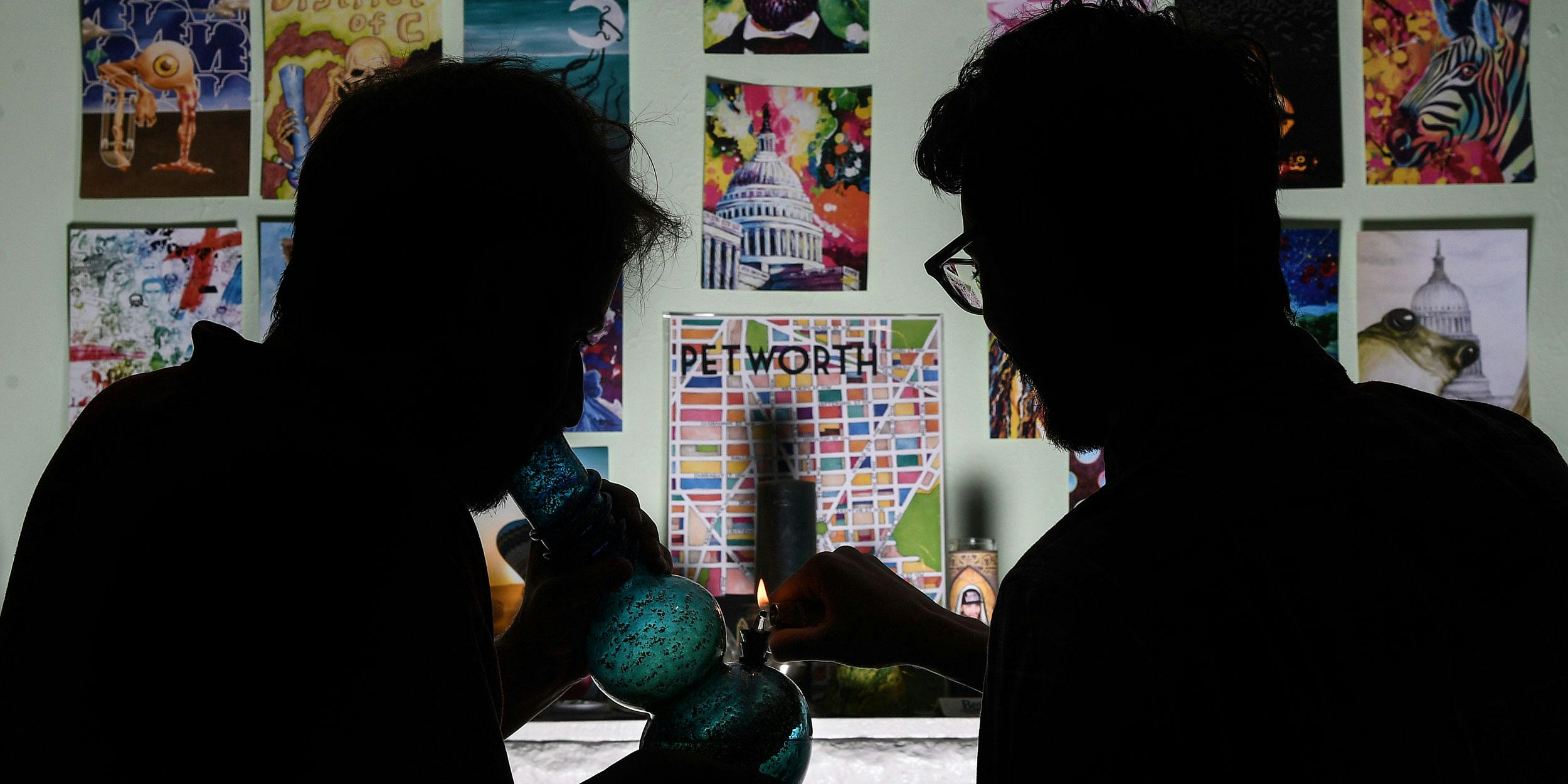 Northwest D.C.residents imbibe in some marijuana in front of their wall of purchased art prints on Friday, May 19, 2017. Each print came with a free “gift” of marijuana. Numerous door-to-door services have sprung up, from websites that will include a “free gift” of week along with your purchase of an $80 T-shirt, or painting or packet of cookies to home growers who will sell you some of their buds and even drive them over. (Photo by Toni L. Sandys/The Washington Post via Getty Images)