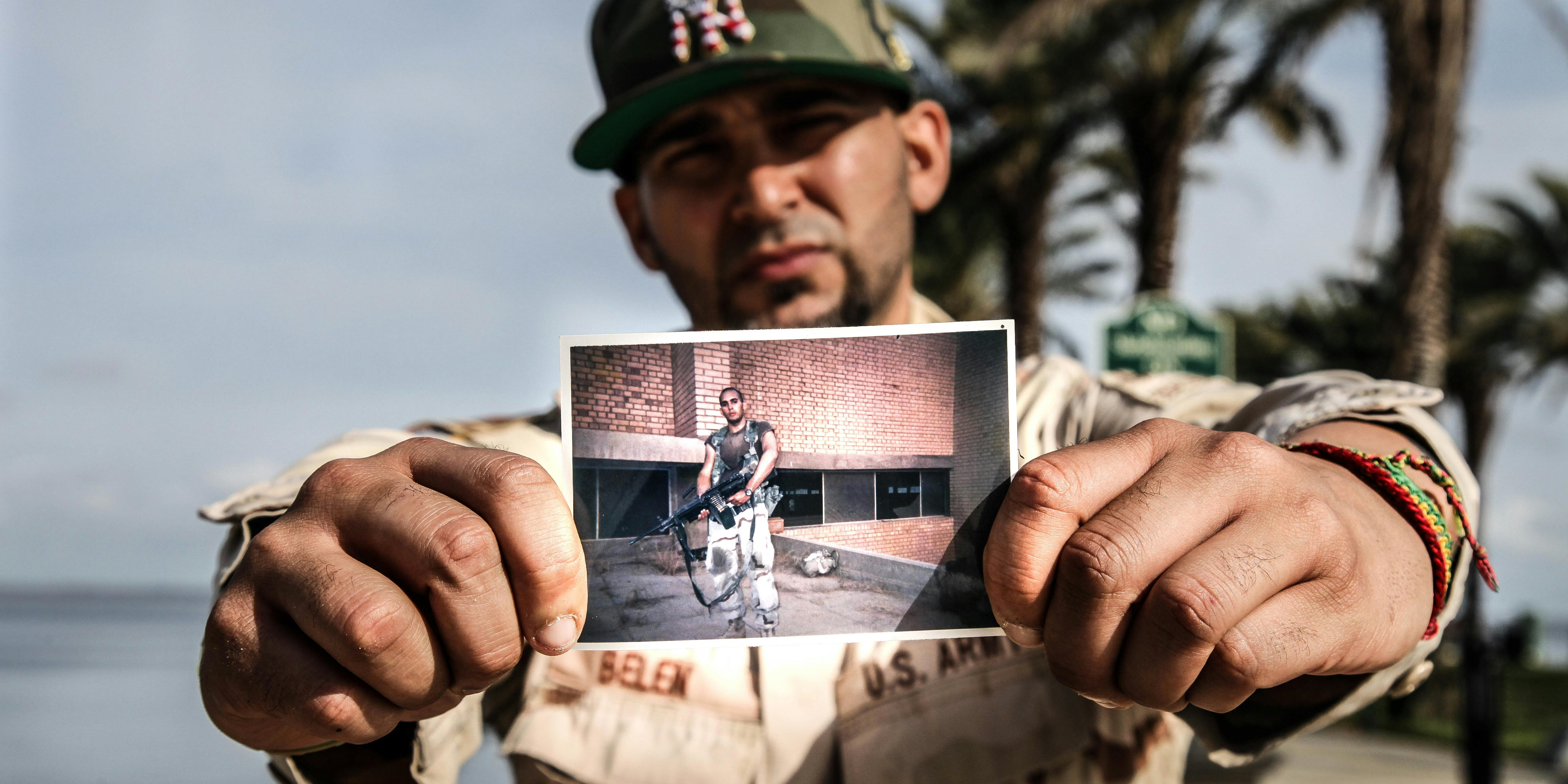 Delirious, he walked into the garage and started digging through the dusty memorabilia. He put on his adorned military jacket—formally known as “dress greens”—over his shorts; a baseball cap embroidered with “Operation Iraqi Freedom,” the first invasion of Iraq following 9-11; and grabbed a paintball gun, which he had painted camel to look just like a rifle.
